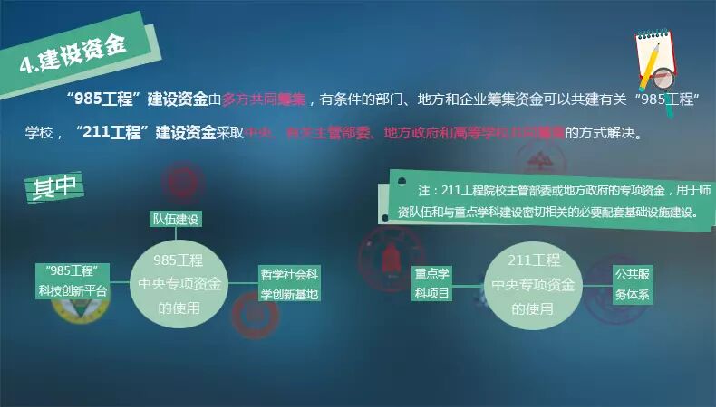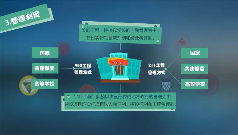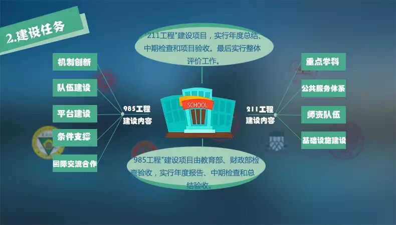 “985工程”建设任务为机制创新、队伍建设、平台建设、条件支撑和国际交流与合作等五个方面;采取国家、共建部门(有关主管部委或地方政府)和高等学校三级管理方式,以高等学校自我管理为主;建设实行项目管理和绩效考评。