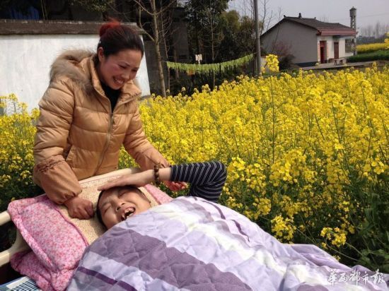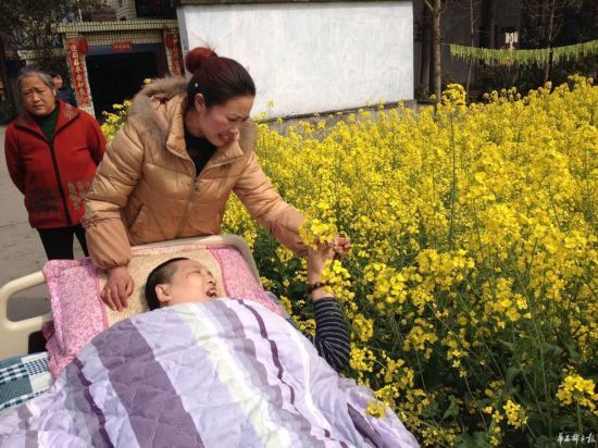 丈夫瘫痪卧床5年,妻子推他去看油菜花。"