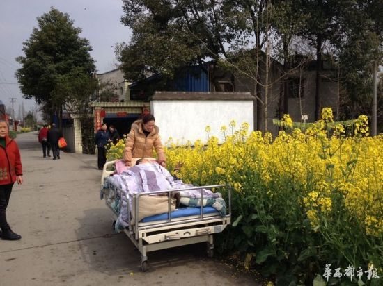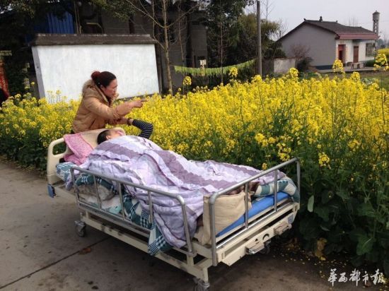 华西都市报3月11日报道,在四川德阳市旌阳区孝泉镇黎郎村,有一位妻子推着躺在移动病床上的丈夫看油菜花。妻子说,丈夫车祸瘫痪已卧床5年,以前最多就是把他弄到院子里晒晒太阳,现在有了可移动病床,每天都可以推着他出来。"