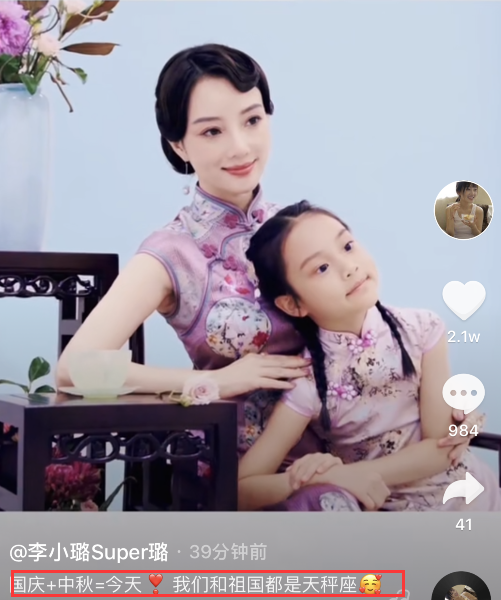 10月1日是国庆节,也是中秋节,李小璐发视频为祖国庆生“国庆+中秋=今天 我们和祖国都是天秤座”。