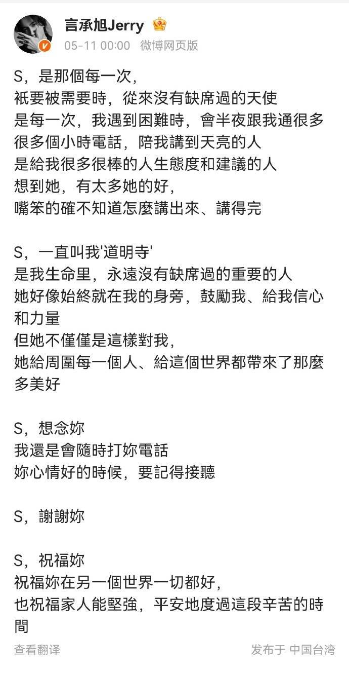 他说,S是那个每一次只要被需要时从来没有缺席过的天使,是自己生命里永远没有缺席过的重要的人。她会在自己遇到困难时陪着讲电话讲到天亮,给出很多很棒的人生态度和建议,“S,想念你,我还是会随时打你电话,你心情好的时候,要记得接听。S,谢谢你。S,祝福你,祝福你在另一个世界一切都好,也祝福家人能坚强,平安地度过这段辛苦的时间。”