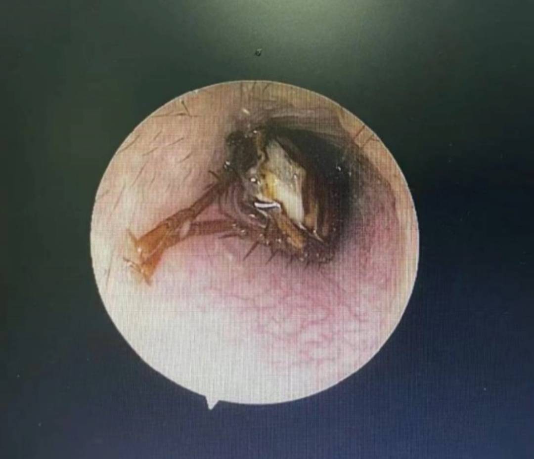 因为甲虫爪子锋利,患者自己试图挖出来,结果导致外耳道皮肤充血肿胀严重。最后,滴入麻醉药让虫子不动后,在显微镜下才将其取出。