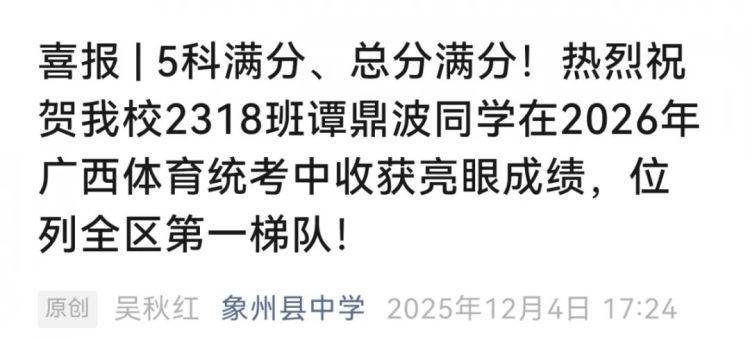 “那个视频是我拍的。”覃冰教练激动地说,当时只想记录感人瞬间,没想到会引起如此大的关注。她介绍,象州县中学建校已有92年,高中办学也有70年历史,这是首位在体育统考中获得满分的学生,刷新了校史纪录,“不仅学生激动,老师们也无比自豪”。