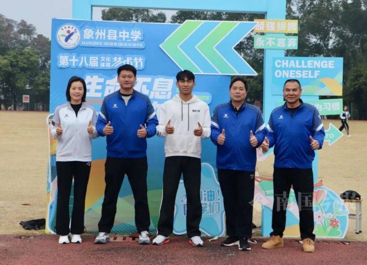 12月4日,负责指导谭鼎波的潘文清、林新忠、罗晨阳、覃冰四位教练与他在校园里合影留念。这位学生不仅是教练们的骄傲,也是母校的骄傲。当天下午,象州县中学微信公众号发布了《喜报》,祝贺谭鼎波在体育统考中5科满分、总分满分,成绩位列广西第一梯队。