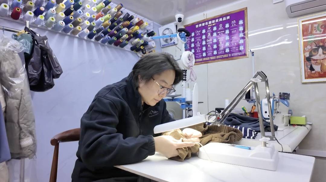 殷玥原先在公司上班,后来转行学习织补技艺。经过五年练习,殷玥已经成为一家织补改衣店的“大师傅”,各种衣服的精细修补都手到擒来。